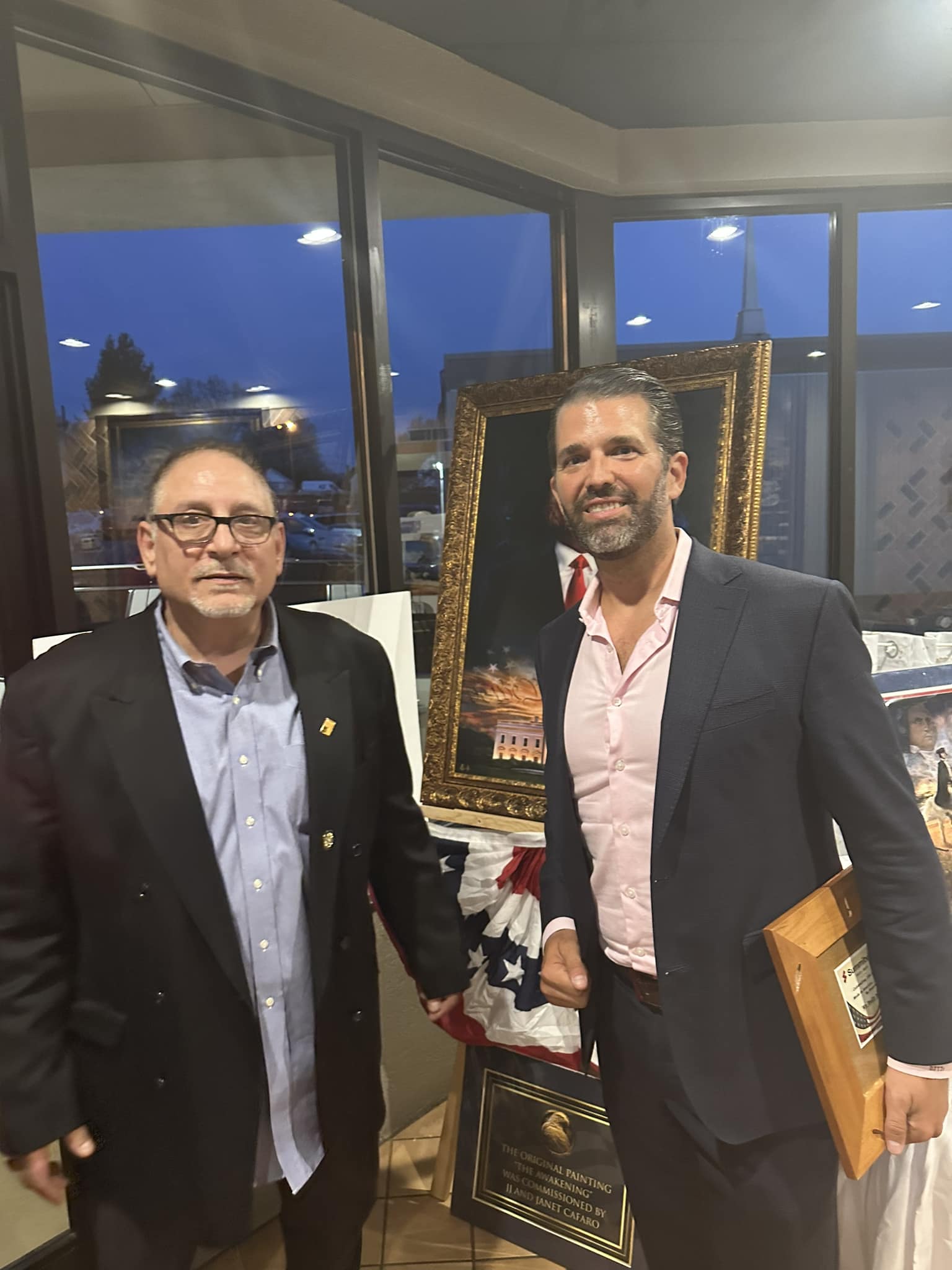 Ray Simon and Donald Trump Jr. standing in front of Ray's portrait of President Donald Trump.