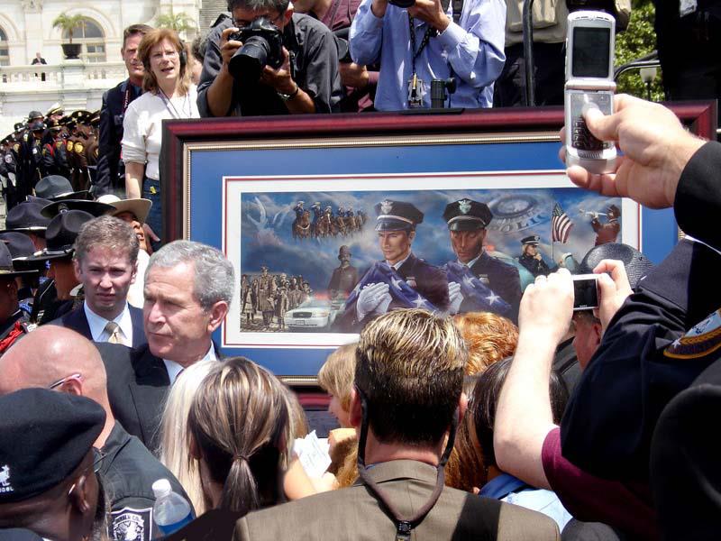 President Bush is presenting one of Ray Simon's pieces at the National Law Enforcement Memorial. The piece depicts the brave officers who put their lives on the line every day to protect us.