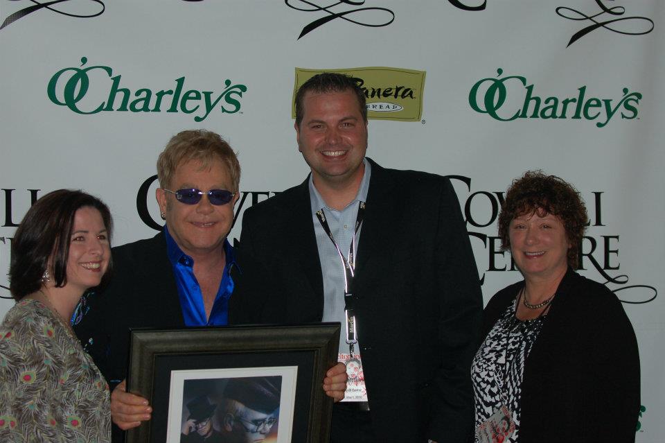 Elton John receives his tribute painting by Ray Simon. Elton was so thrilled with the piece he took it back to England with him.