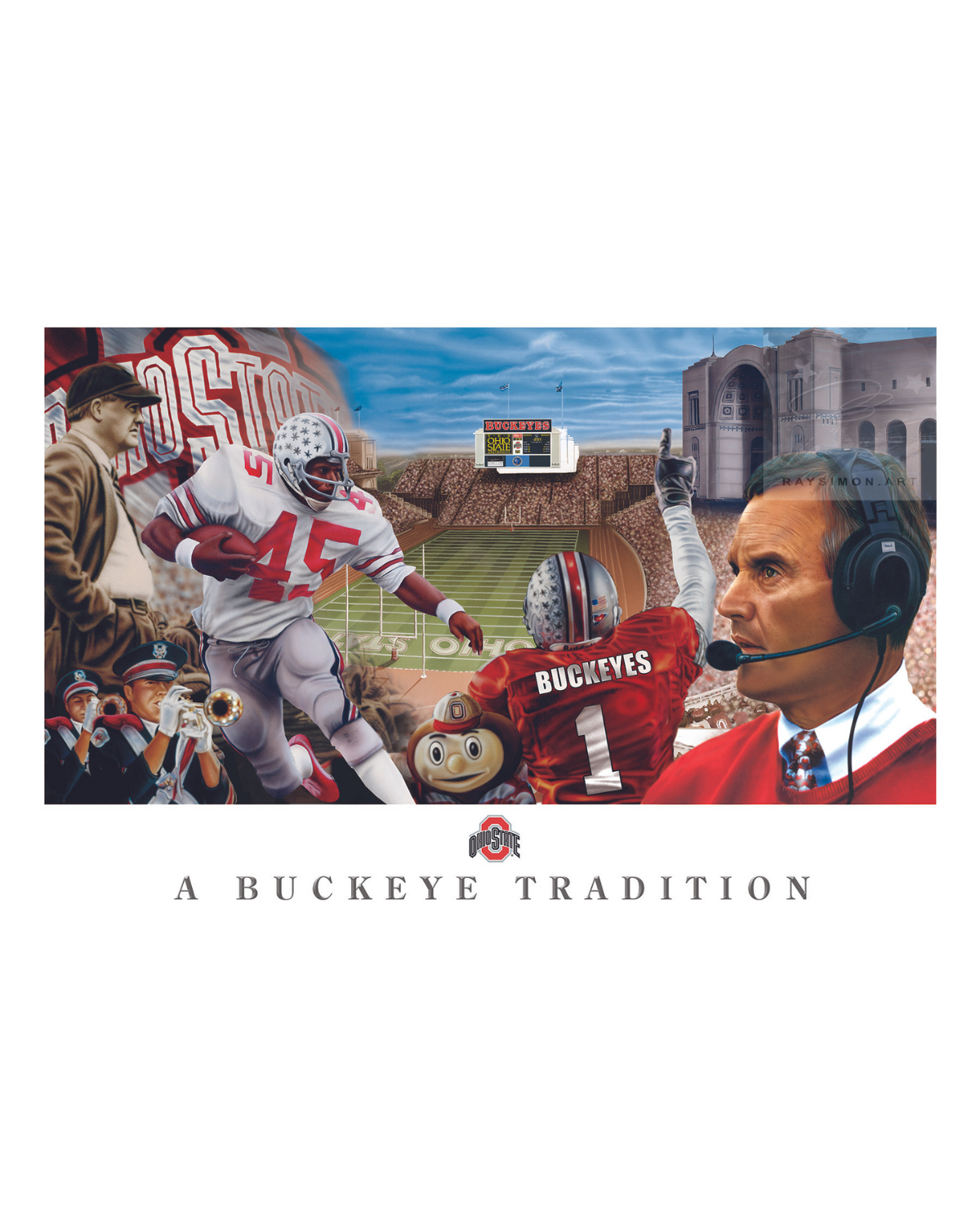 Elevate your decor with "A Buckeye Tradition," a captivating painting that encapsulates the rich heritage of the Ohio State Buckeyes during Jim Tressel's influential coaching era. This artwork serves as a timeless tribute to the team's iconic moments, immortalizing a significant chapter in the Buckeyes' illustrious football history.