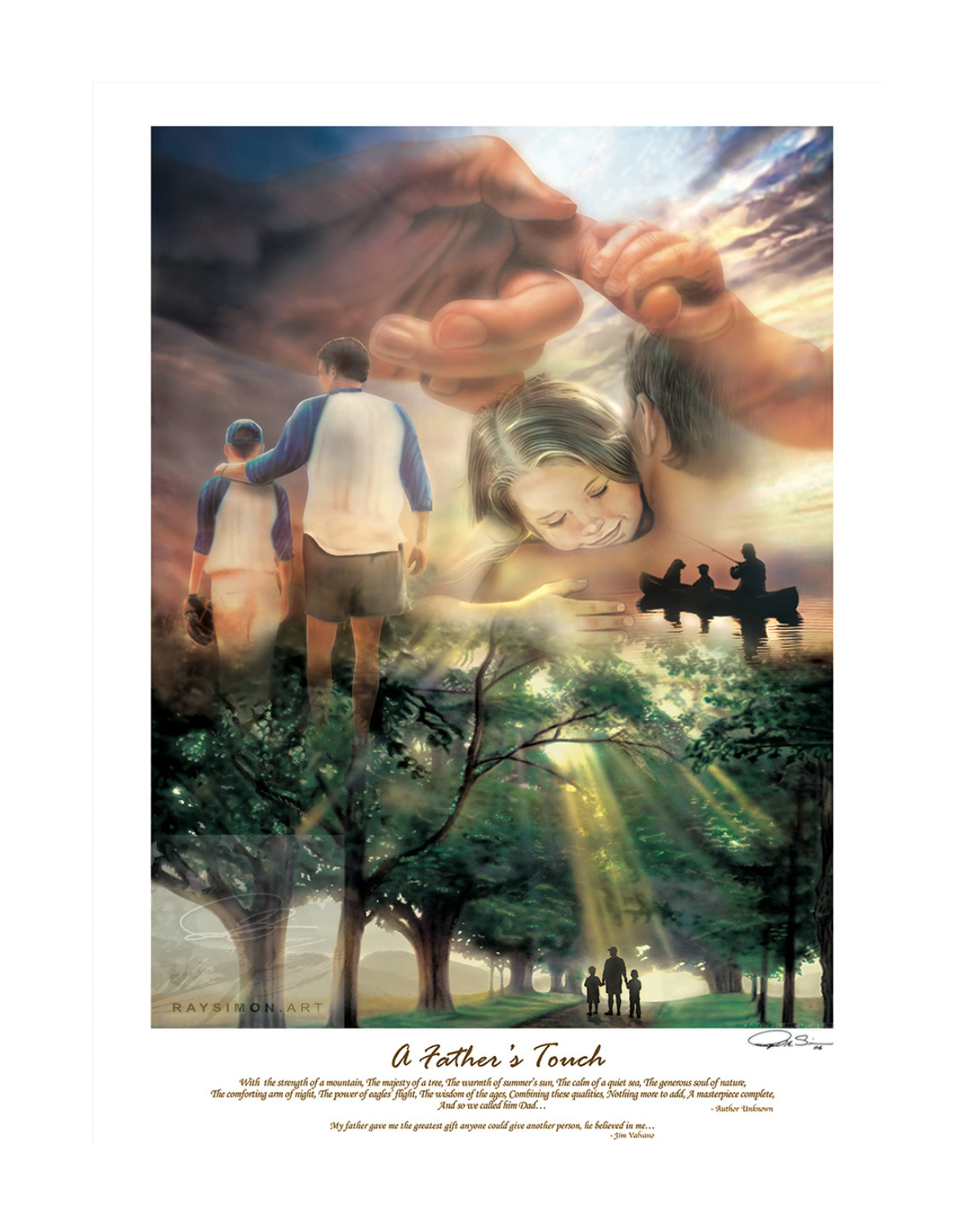 Experience the depth of paternal love with "A Father's Touch," a poignant painting by Artist Ray Simon that beautifully captures the essence and enduring impact of fatherhood. This artwork is a tribute to the countless moments and lessons shared between a father and his children, illustrating the unique bond that only a father can provide.
