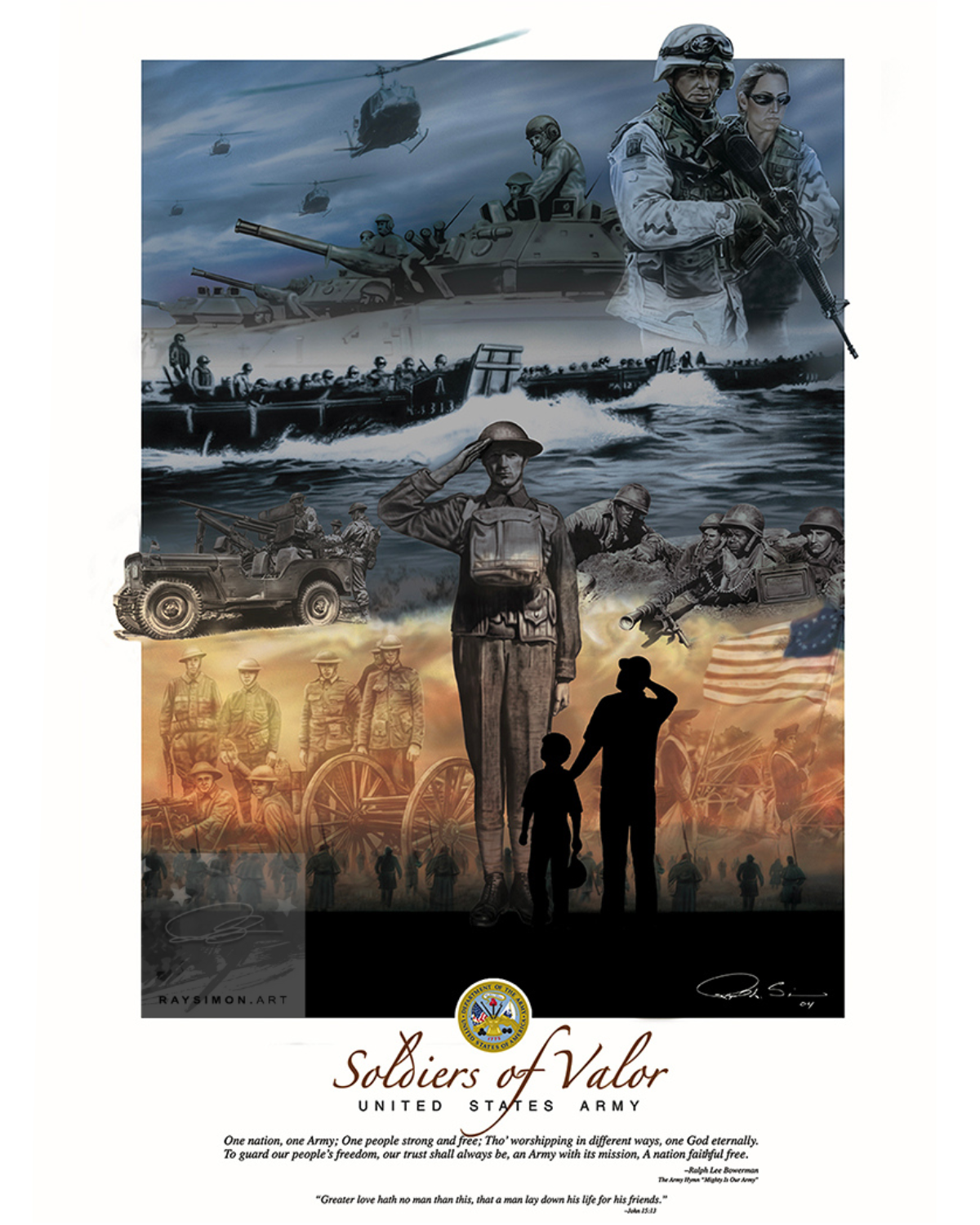 Behold the profound tribute captured in "Soldiers of Valor," a masterful creation by Artist Ray Simon that reverently honors the unwavering commitment and sacrifice of the United States Army. This artwork stands as a resolute testament to the valor, unity, and selflessness that define those who serve under the banner of freedom.