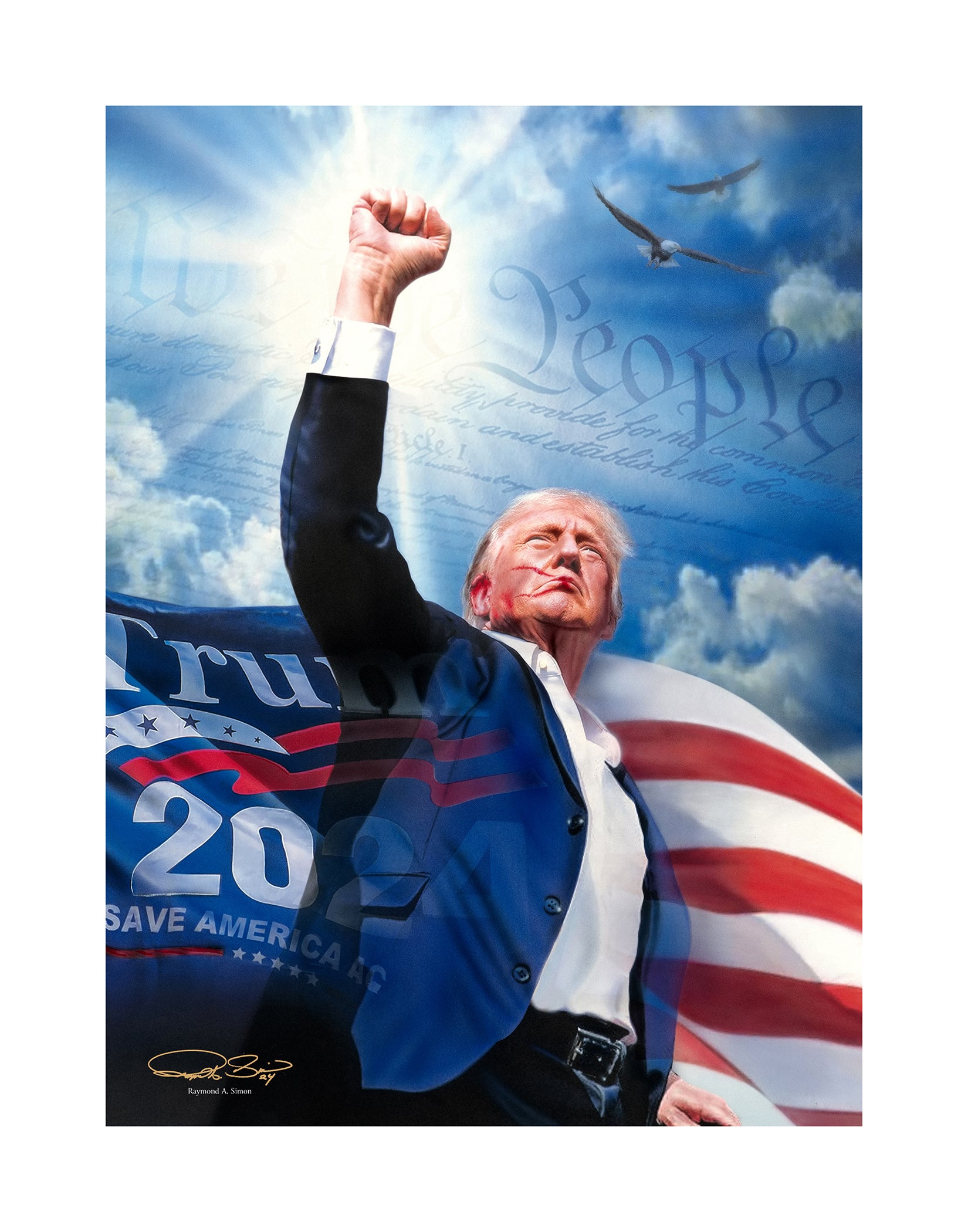 Immerse yourself in a moment of resilience and determination with "Fight, Fight, Fight," a thought-provoking piece that captures a pivotal event in American history. This powerful artwork by Ray Simon portrays Donald Trump after an attempted assassination at a campaign rally, symbolizing unwavering courage and defiance.