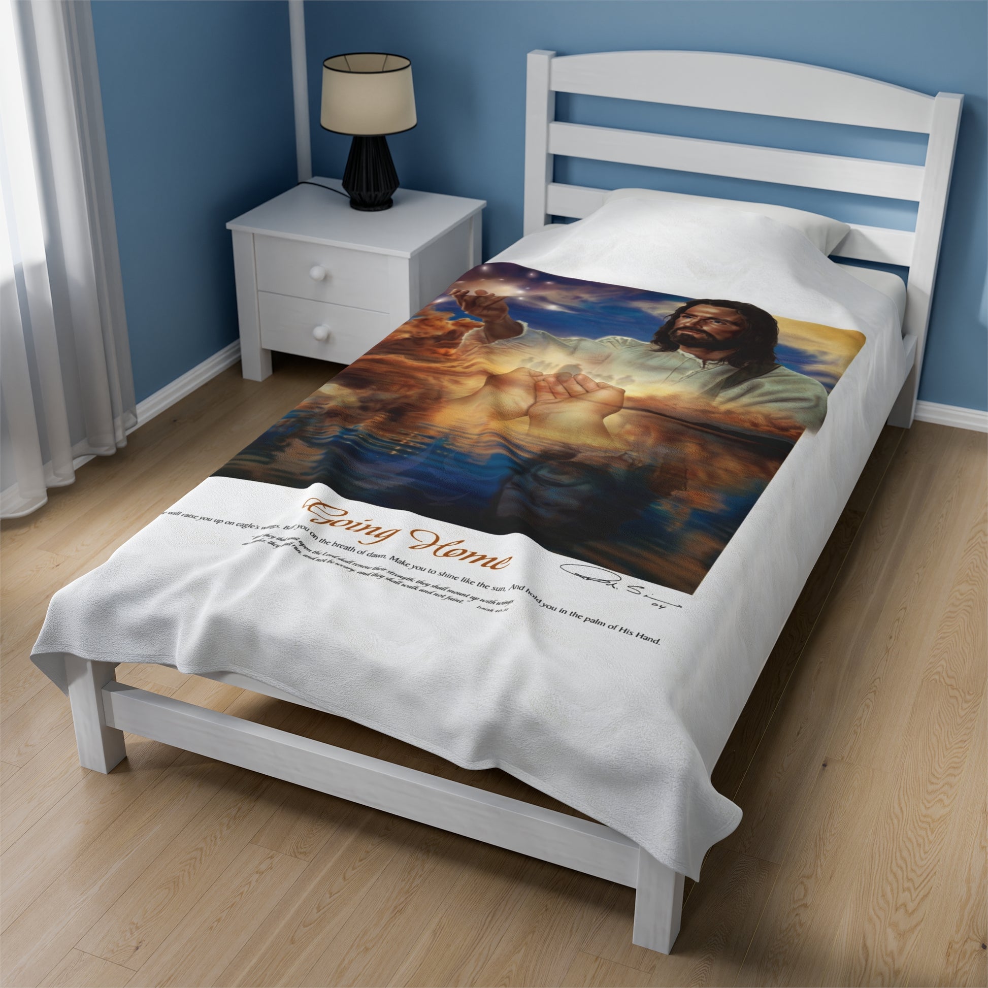 Wrap yourself in the profound essence of the eternal journey with our "Going Home" Velveteen Plush Blanket. This luxurious blanket is more than a source of comfort; it's a captivating artwork that transcends time, symbolizing the passage from life's sequential chapters to the boundless realm of eternity. Inspired by the gentle embrace of a child's hands guiding us homeward, this piece evokes the purity of innocence and the boundless love of our Creator.