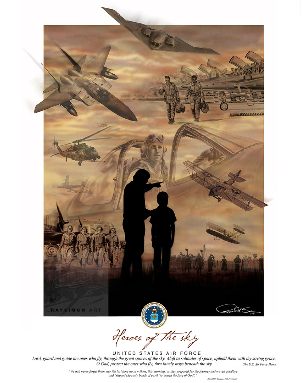 Launch on a journey through time with "Heroes of the Sky," an eloquent tribute by artist Raymond A. Simon to the unwavering heroism and remarkable innovation of the United States Air Force. This masterpiece encapsulates the rich legacy of aviation, from the inaugural flight of the Wright Flyer to the cutting-edge B-2 Spirit Stealth Bomber, symbolizing the remarkable evolution of aerial prowess.